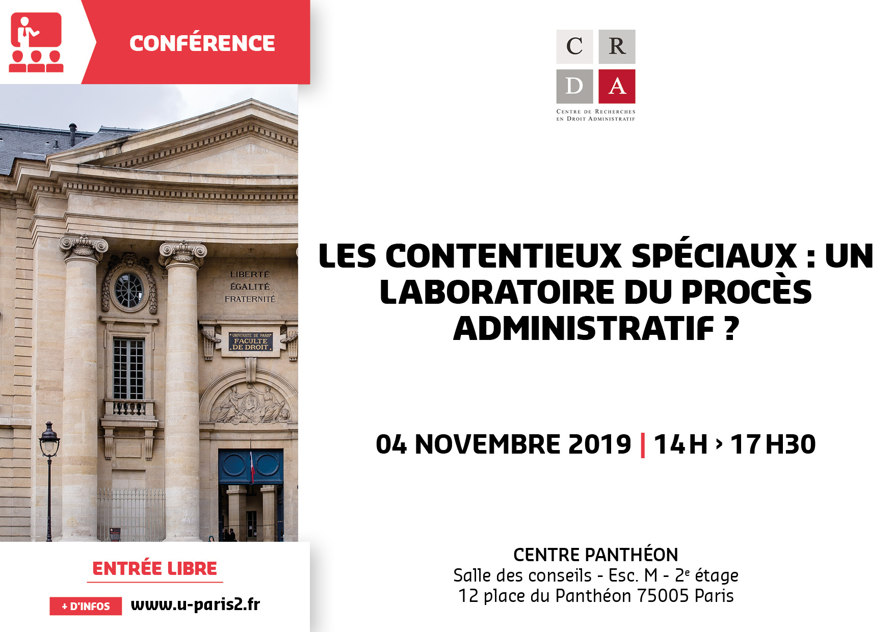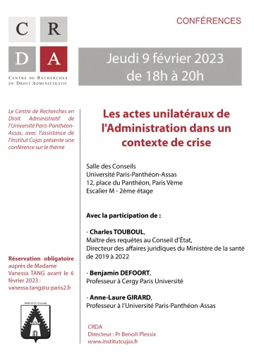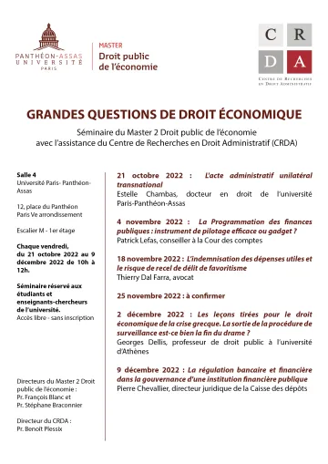 | Vendredi 23 novembre | Conférence d'actualité (17h00-19h00) | Une nouvelle étape dans l'amélioration des rapports entre l'administration et les administrés ? A propos de la loi du 10 août 2018 pour un état au service d'une société de confiance |