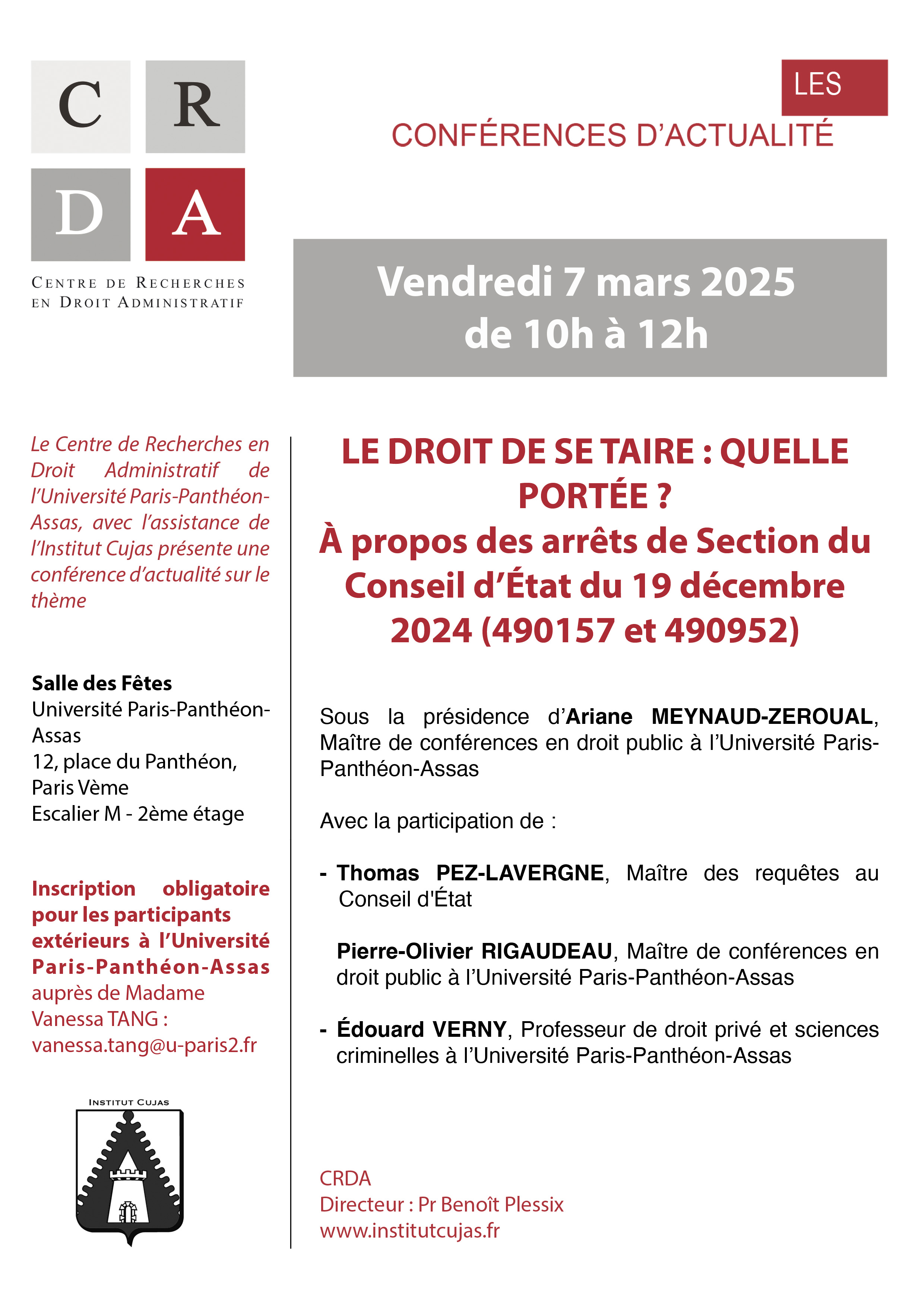 | Jeudi 28 novembre | Conférence d'actualité (14h30-16h30) | Le sens du silence de l'administration : perspective française et internationales |