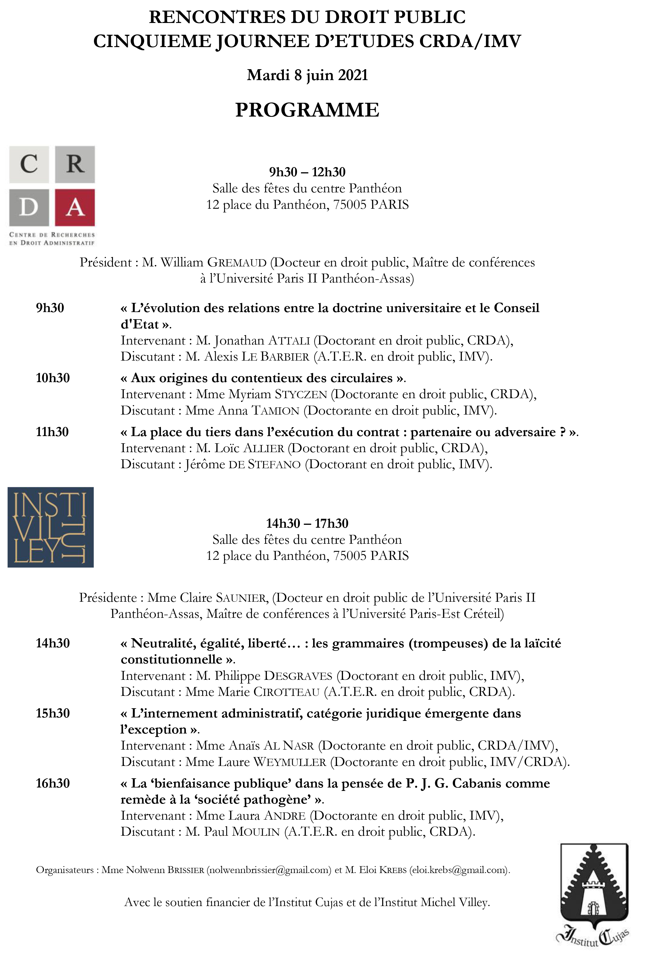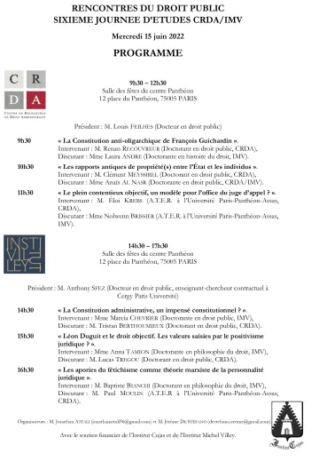 | Vendredi 27 mai | Journée d'études partagée avec l'Institut Michel Villey (09h30-17h00) | |