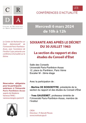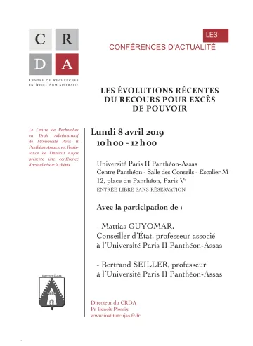 | Jeudi 22 mars | Journée d'études (9h30-16h30) | Cent ans après l'arrêt Boussuge, actualité du recours pour excès de pouvoir |