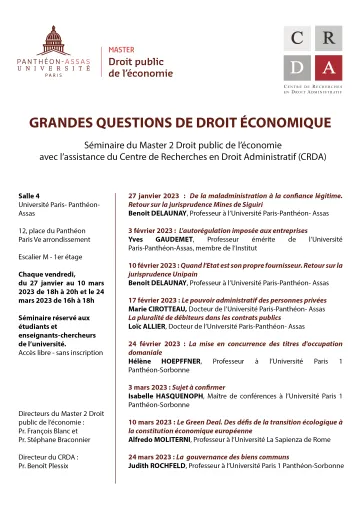 | Lundi 18 mars | Conférence d'actualité (14h30-16h30) | La distinction des biens de retour et des biens de reprise dans les concessions |