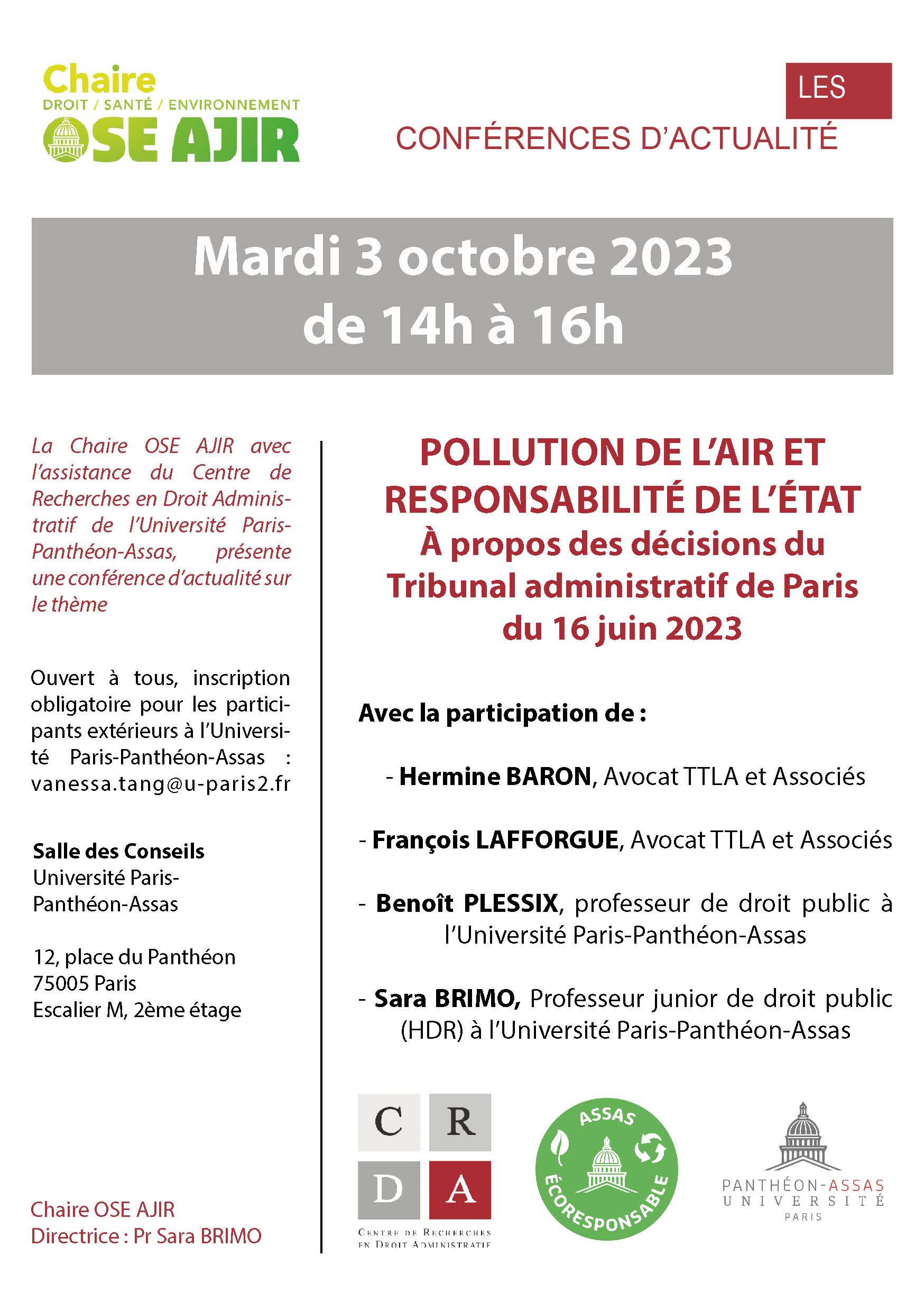 Dans le cadre de la semaine du développement durable à l'Université Paris-Panthéon-Assas et de la campagne Assas Écoresponsable, la chaire Observatoire Santé et Environnement – Analyse Juridique et InterdisciplinaiRe (OSE-AJIR) et le Centre de recherches en droit administratif (CRDA) et organisent une conférence sur le thème « Pollution de l’air et responsabilité de l’Etat » , le mardi 3 octobre à 14h au Centre Panthéon.